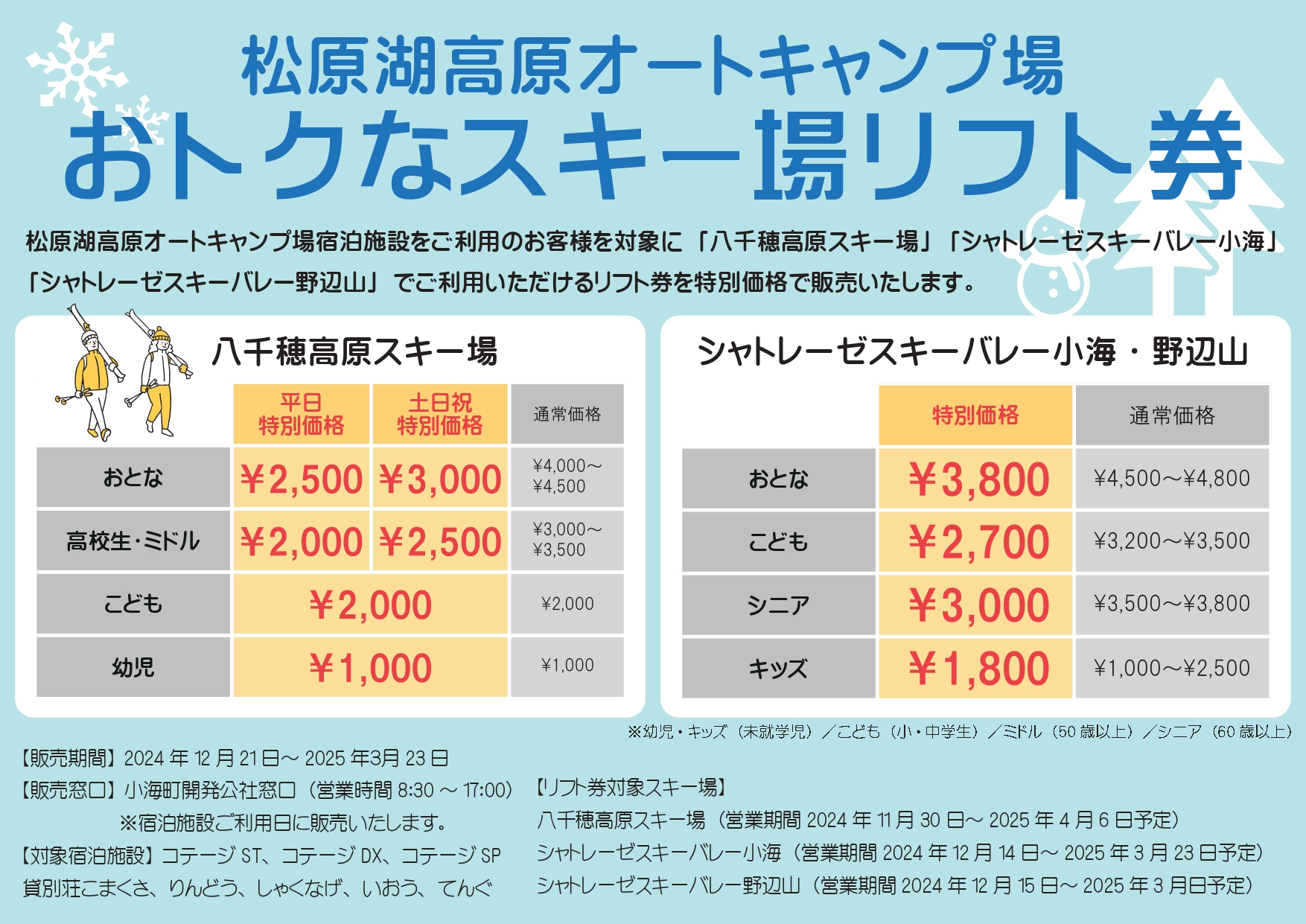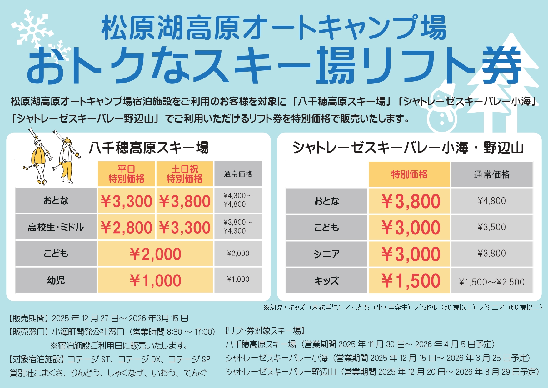 12月27日からおトクなスキーリフト券を販売します⛷ 新着情報 | 2025.12.24 (水) 松原湖高原オートキャンプ場のコテージ・貸別荘をご利用のお客さまを対象に、「シャトレーゼスキーバレー小海」「シャトレーゼスキーバレー野辺山」「八千穂高原スキー場」でご利用いただけるリフト券を特別価格で販売いたします。販売期間は2025年12月27日から2026年3月15日まで。小海町開発公社の受付で宿泊施設ご利用日に販売いたします。詳しい内容は料金表をご確認ください。 « 前のページ
